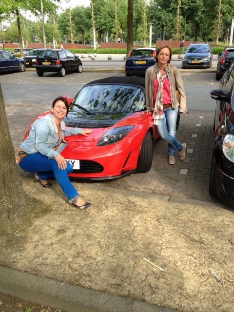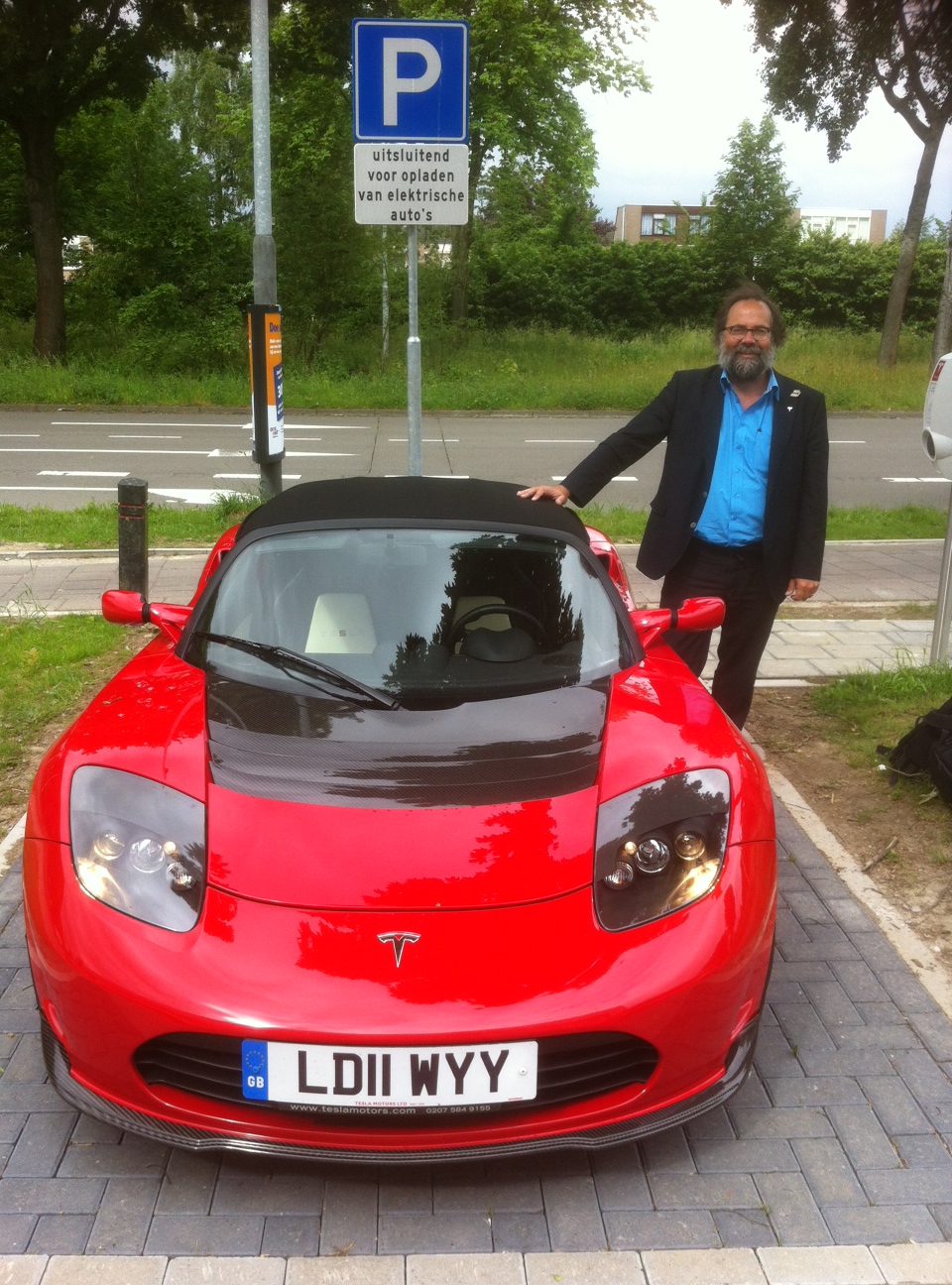 Op vrijdag heb ik een Tesla Roadster (de laatste 40 (update 13-12-12: nog 15) zijn nog te krijgen in Europa!) opgehaald bij de Benelux vestiging van Tesla in Eindhoven. Mijn zoon Yuri had er al eens eens gereden voor het blad van de studievereniging Simon Stevin van Werktuigbouwkunde van de TU/e, dus die baalde behoorlijk dat hij terug moest rijden in onze Kangoo. Ik ben eerst naar de TU/e gereden, en kon mooi voor ons gebouw parkeren bij de oplaadpaal. Niet aangesloten, want de Tesla was helemaal vol geladen, met een range van 330km nog te gaan. Heel veel studenten kijken op als ik uitstap, blijven staan kijken, en maken foto’s, later op facebook verschijnen ze. Na een vergadering heb ik eerst met de secretaresses een rondje gereden, natuurlijk, in zo een auto is gender diversiteit belangrijk.