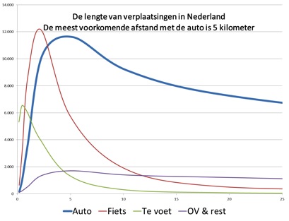 In deze figuur staat horizontaal de afgelegde rit afstand, en verticaal het aantal ritten van de onderzochte groep. We kunnen zien dat korte ritten van pakweg 2 km meestal met de fiets worden afgelegd. Langere ritten gebeuren meestal met de auto waarbij de piek net boven de 5 km per rit ligt.