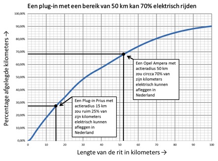 Het antwoord op de vraag hoeveel plug-in’s elektrisch kunnen rijden hangt dus af van de grootte van de batterij. Een batterij die goed is voor 15 km komt net boven de 25%. Een van 30 km voor de helft van de ritten. Een batterij die goed is voor 50km kan 70% van de kilometers elektrisch afleggen.