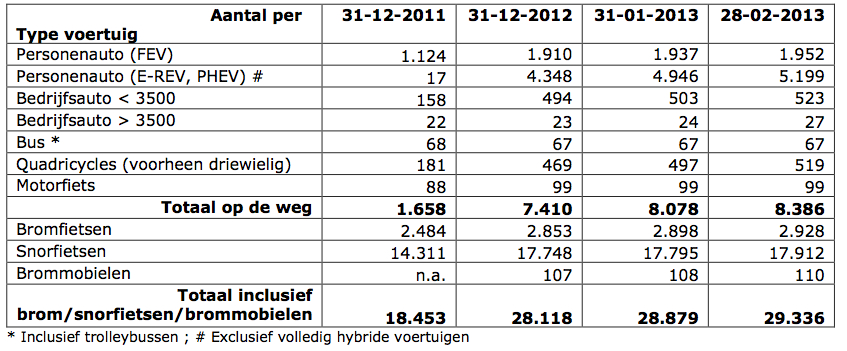 Hier de nieuwe cijfers elektrisch vervoer t/m februari 2013. De cijfers die hier getoond worden zijn samengesteld door Agentschap NL, in opdracht van het ministerie van EZ. Meer informatie komt op deze website.