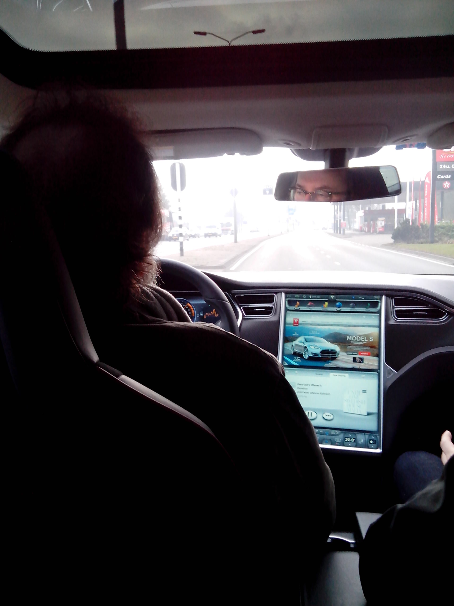 Om 10.00 had ik de Model S een uur voor ons gezin gereserveerd, en ben ik naar ons huis gereden. De Dusseldorf ervaring was alweer enige tijd geleden, dus het was weer heerlijk om te rijden en dat gevoel van een sportwagen te hebben, terwijl je in een prachtige, comfortabele luxe auto zit. Gert-jan van Tesla noemt de Model S een wolf in schaapskleren. Bij ons huis aangekomen hebben we mijn dochter, haar vriend, en mijn vrouw opgehaald. Omdat er altijd iemand van Tesla bijzit, heb ik bij ons huis even gewacht, en heeft mijn zoon een paar rondjes gereden in Brandevoort. Mijn vrouw vond het achterin niet erg ruim, en ook de