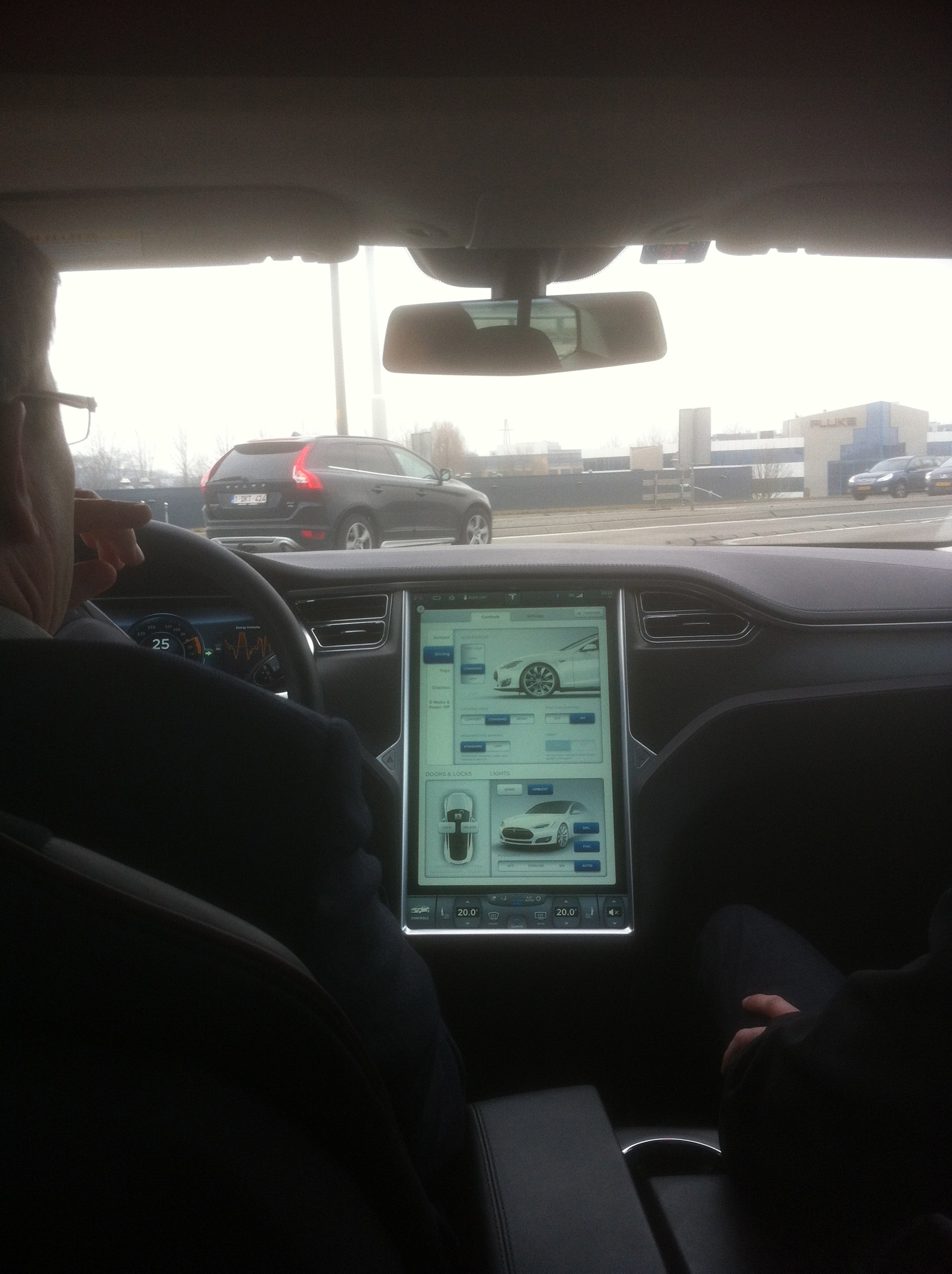 Gisteren, vrijdag 29 maart, had ik de mogelijkheid om van ‘s morgens 9 uur tot ‘s middags 14:00 met de Tesla Model S namens Athlon Car Lease een aantal proefritten te maken, en dan alleen met serieuze potentiële kopers. Kenan Aksular van Athlon had dit voor me geregeld. Het is een intensieve maar leuke dag geworden, en ik voelde mij als een kersverse product specialist bij de Tesla store in Eindhoven. Ik was al een paar weken aan het voorbereiden: mensen uitnodigen, een schema maken, per halfuur gepland. Gisteren was het dan zover, om 9 uur kwamen mijn eerste gasten, 3 TU/e medewerkers. Ook waren er een paar zoons meegenomen (waar bleven de dochters??). Het eerste half uur werd er iets teveel koppel op de 21″ banden gezet, voor dit koude weer. Winterbanden met 19″ zijn verstandiger met deze koude. De Porsche rijder (1 van de 3) was geheel overtuigd na de rit, hoewel oorspronkelijk