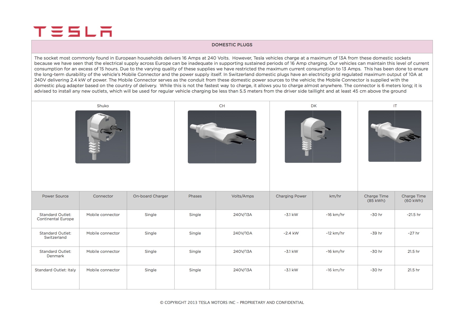 Alles over de stekkers en het laden van de Tesla Model S in de EU, voor de volledige datasheets zie hier en hier, gevonden via de Tesla Motor Club. Het goedkoopst voor thuis is een simpele krachtstroom aansluiting van 3x16A. Voor het thuisladen kun je ook een officieel station laten aanleggen zodat je ook kunt bijhouden hoeveel je hebt getankt, zie bv Cohere. Voor het opladen bij openbare laadpunten raad ik een 8m 3x32A type2/type2 kabel aan. Die moet je zelf kopen, want die geeft Tesla er niet bij. De goedkoopste volgens mij is deze.