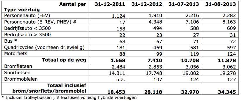 Hier de nieuwe cijfers elektrisch vervoer t/m augustus 2013. Totaal nu 10445 EV en PHEV auto’s in Nederland op kenteken, en daarmee zien we de start van de verwachte versnelling: de Outlander is uitverkocht (ca 10000), de Volvo V60 PlugIn Hybrid (ca 1000) is uitverkocht, de volledig elektrische Tesla Model S is voor dit jaar uitverkocht (ca 1300). De BMWi3 is nu ook te koop. De fiscale regels van nu helpen daar natuurlijk bij. Het is zaak dat we voor volgend jaar ook een gezonde fiscale prikkel hebben. De markt zit nog steeds in een erg vroege fase!