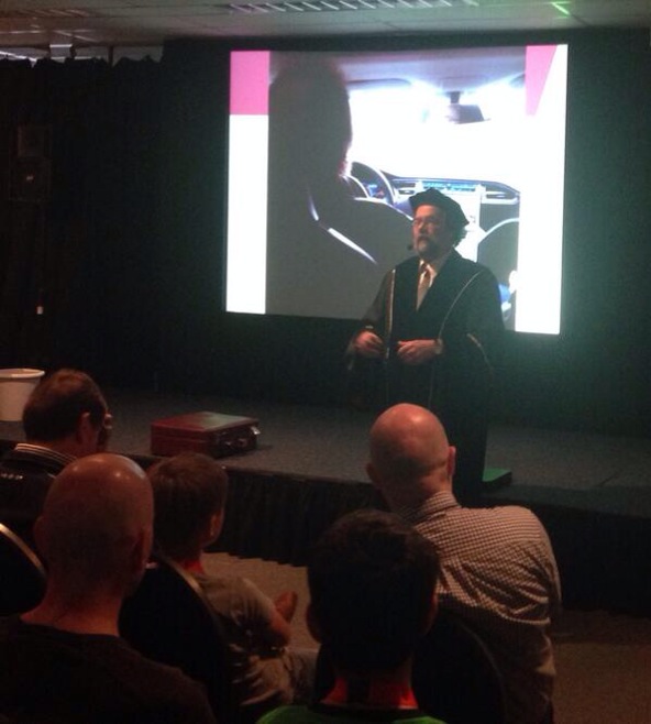 Ik zelf heb drie keer een kindercollege gegeven met als onderwerp schone en slimme auto’s. Ik kwam elke keer de zaal in op een elektrische fiets, en daarna ging ik dan mijn toga aandoen. Met grijze das (met knoop erin), en met mijn naam geborduurd, dat liet ik