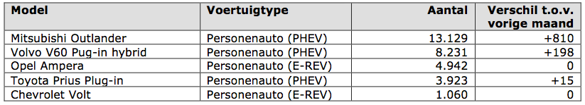 Ook interessant is de verdeling over de diverse merken, totaal aantal (top 5) PHEVs hieronder (vergelijk met mei), en de groei: