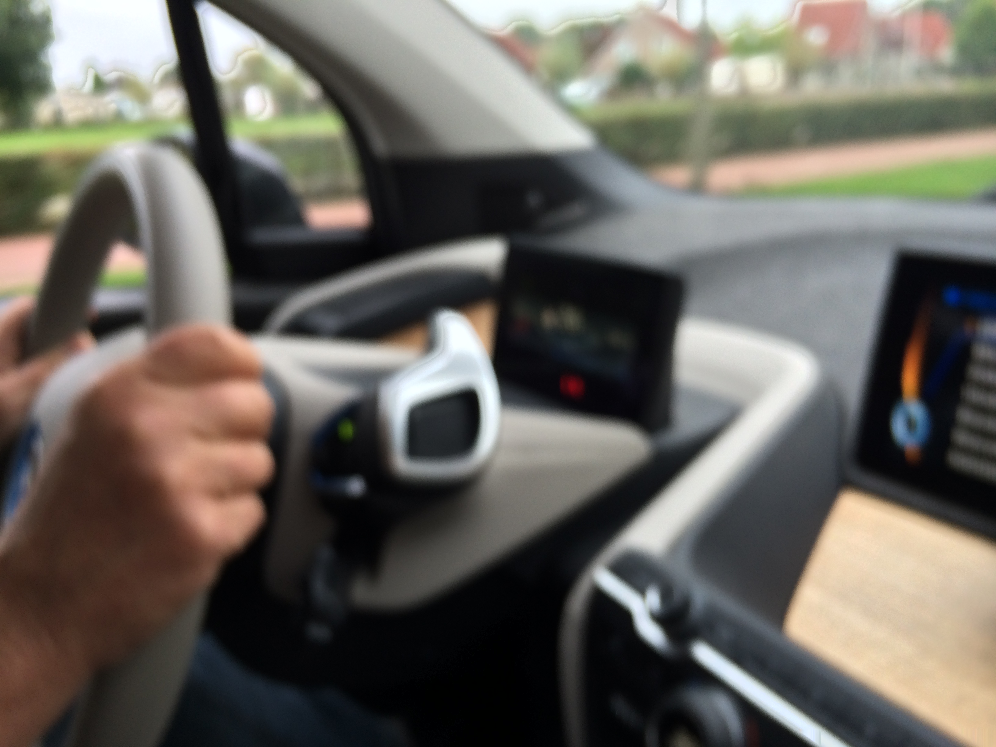 De hellingproef ging goed: zonder actief een ‘handrem’ te gebruiken (dat is namelijk echt ouderwets), rolt de BMW i3 inderdaad niet naar beneden, en kun je door het stroompedaal te gebruiken netjes wegrijden. Achteruit rijden is een genot in de BMW i3: op het middendisplay zie je via de camera achter je, met daarbij geprojecteerd hoe je gaat rijden, afhankelijk van de stand van je stuur. Een automatische parkeerfunctie kon ik niet vinden (maar blijkt er wel te zijn, zie ook het commentaar verderop). De waarschuwing voor objecten is ook mooi gedaan in het display.