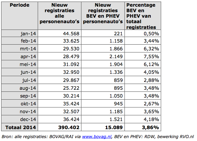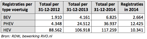 De volgende tabel geeft naast de registraties van volledig elektrische (BEV) en plug-in hybride voertuigen (PHEV) ook de registraties weer van volledig hybride voertuigen (HEV). Net als in 2013 zijn er in 2014 meer plug-in hybride voertuigen geregistreerd dan volledig hybride voertuigen.