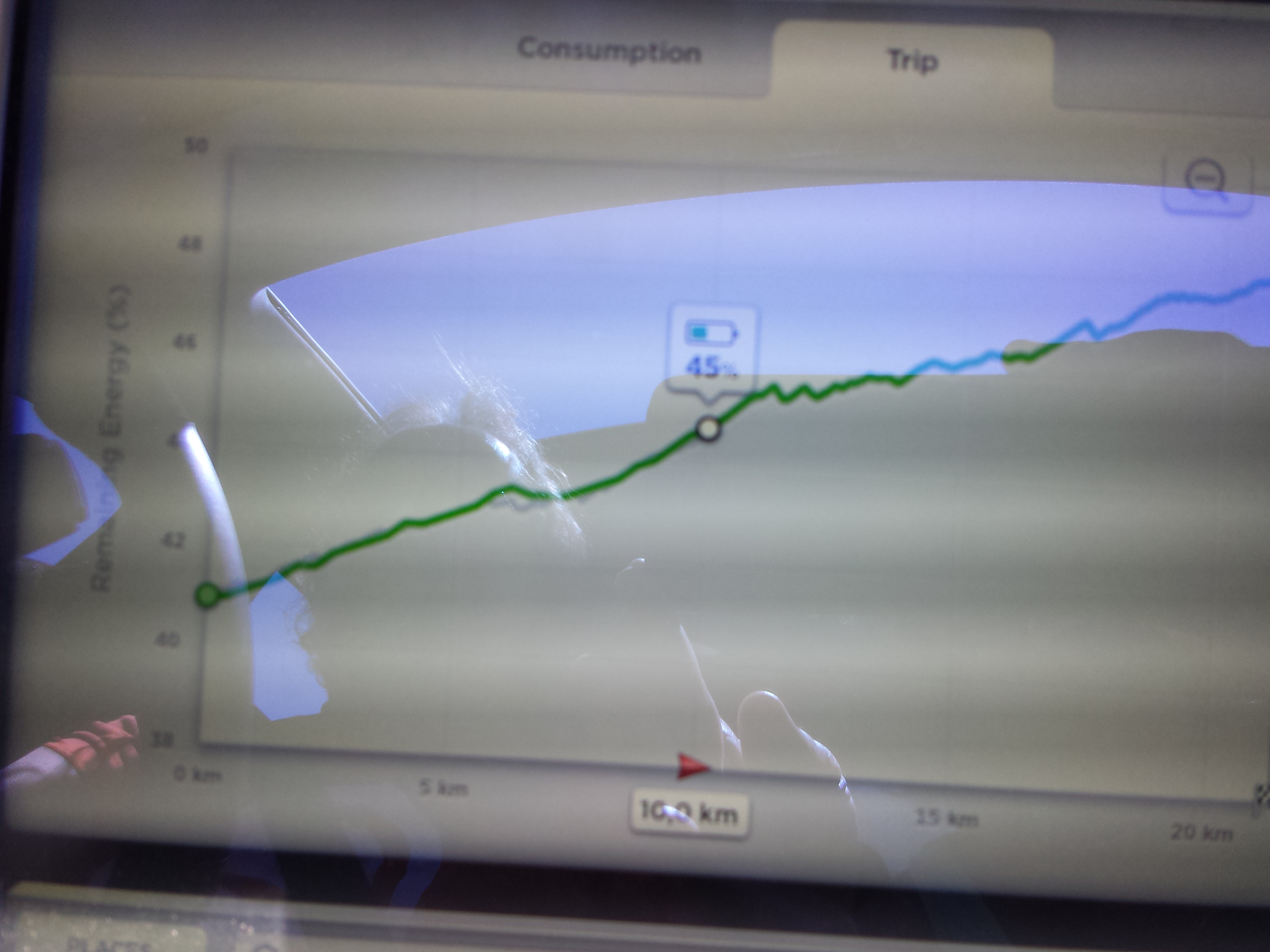 Het plaatsje Pernes ligt vlak bij de Mont Ventoux, en daar zijn we natuurlijk ook op geweest. Voor het eerst de tripvoorspeller omhoog zien lopen vlak voor de afdaling: door het regeneratieve werken van de auto, geeft de hele route omlaag (vanaf ruim 1900 m hoogte) heel veel energie terug.