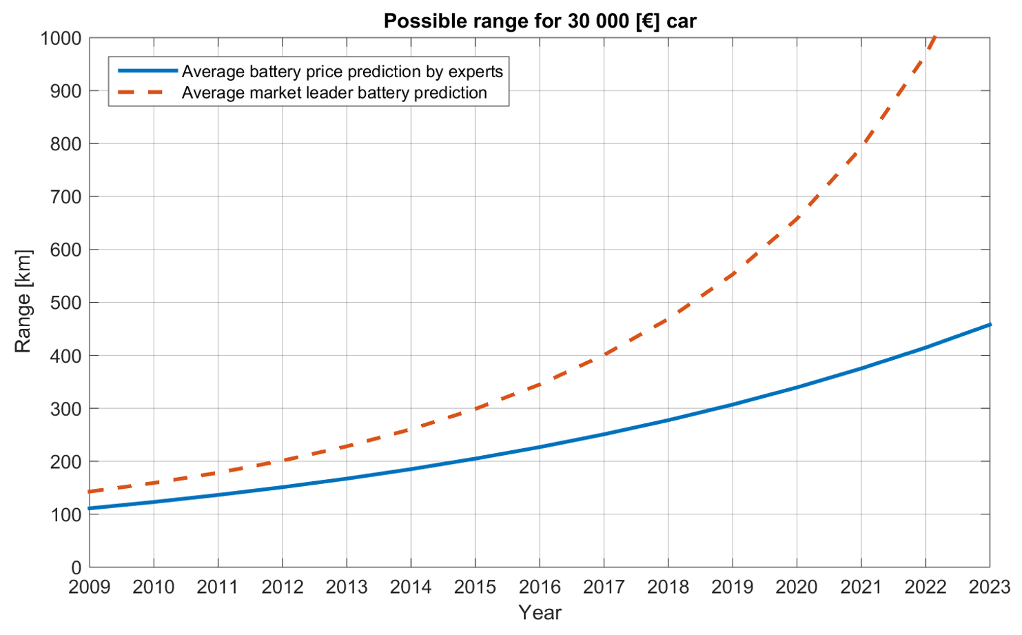 Electric cars use their energy more efficiently than fuel cars and are therefore cheaper to drive. Considering that the world will switch to mainly solar PV, electric cars require only a small area of solar panels compared to the size needed by inefficient energy carriers like hydrogen, petrol and artificially produced fuels. They therefore have the highest so-called ‘sun-to-wheel’ efficiency. The electric cars’ main problem today (range) will be solved before 2020. Exponentially decreasing battery price trends indicate that by 2020 electric cars will have a 400 km range for the same affordable price as its combustion counterparts.
