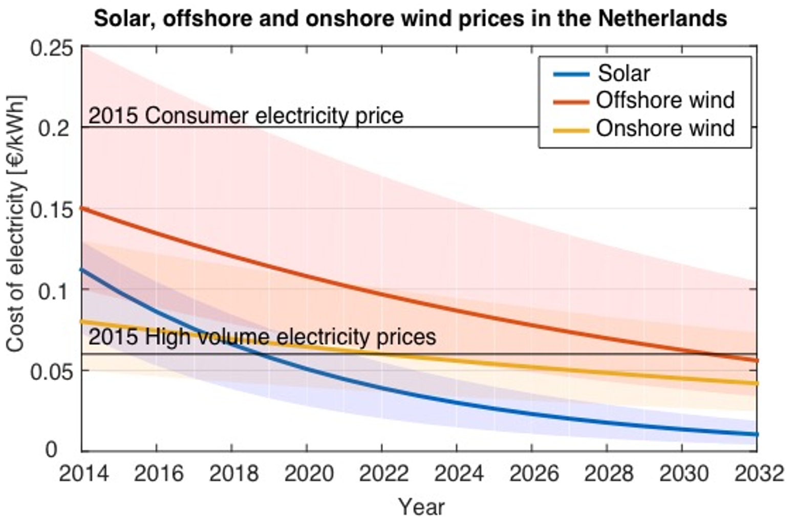Solar panels have been following an exponential decrease in price since the 1980s and are reaching grid parity (prices equal to electricity grid prices) in the coming few years. It is possible that solar energy will cost only a few cents per kWh in 2030. Wind power will also become exponentially cheaper but its price trend is far less steep compared to solar. Since solar energy is not a continuous power source, both seasonal as well as daily buffering will be needed to capitalize on this ‘cheap energy source’.