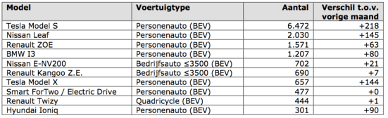 Het is interessant te zien dat het aantal volledige elektrische auto’s (BEV) inderdaad nu aan de winnende hand is gekomen: 749 voor deze maand, tegen zelfs een afname van 83 Plug in Hybrides (PHEV). Dit zal de nieuwe trend zijn denk ik vanwege de veranderde fiscale benadering, en de beschikbaarheid van modellen. Voor 2017 verwacht ik een totaal aan nieuw verkochte volledig (batterij) elektrische modellen van ca 9000. Het eerste kwartaal kwam uit op 1630, zie de tabel verderop. Met name de 2de helft van het jaar zullen de verkopen van BEVs nog verder toenemen denk ik. In de loop van 2017 komen de vernieuwde Renault Zoe (al in januari leverbaar, 300 km range, 29.900 €), en vooral de Opel Ampera-e (juni?, 400 km range, en 38.000€?) op de NL markt. In 2018 volgen dan de 300+km (en <40k€) Nissan Leaf 3, BMWi3, en de Tesla Model 3. Zowel voor particulieren, als ook voor zakelijke rijders (4%) zeer interessant!