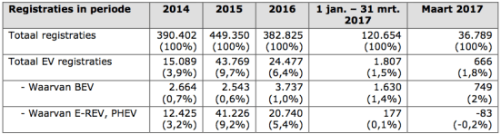 Voor het personenwagen totaal is de toename in maart dus: 666 (feb: 453), waarvan volledig elektrisch (BEV) 749 (feb: 413) en plug-in hybrides of met range extender (PHEV) -83 (feb: 40) (netto) verkopen in een maand. Het effect van de verhoogde bijtelling in 2017 is zeer duidelijk!