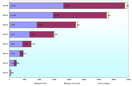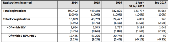 Hierbij de nieuwe Nederlandse cijfers elektrisch vervoer t/m september 2017. Het aantal verkopen in september was 946 (aug: 461), (dus 946+371=1317 nieuw verkochte, want 371 EVs zijn uitgeschreven vanwege export) en het totaal is nu gekomen op 116.817 personenauto’s met een stekker in Nederland op kenteken (eind aug: 115.871). Totaal zijn er nu 18.299 volledig batterij elektrische personenwagens in Nederland. Daar komen overigens nog 37 waterstof auto’s bij. Dat zijn tenslotte ook volledig elektrische auto’s. Het totaal is dan 18.336.