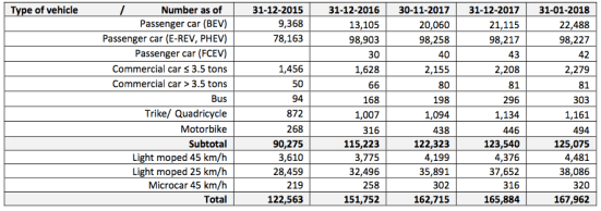 De verdubbeling van de verkopen van volledig elektrische voertuigen zet door. Het aantal verkopen in januari 2018 was 1383 (dec: 1041), (in januari 1383+328=1711 nieuw verkochte, want 328 EVs zijn uitgeschreven vanwege export) en het totaal is nu gekomen op 120.715 personenauto’s met een stekker in Nederland op kenteken (eind dec: 119.332). Daarvan zijn er nu 22.488 volledig batterij elektrische personenwagens in Nederland. Daar komen overigens nog 42 waterstof auto’s bij. Dat zijn tenslotte ook volledig elektrische auto’s. Het totaal is dan 22.530.
